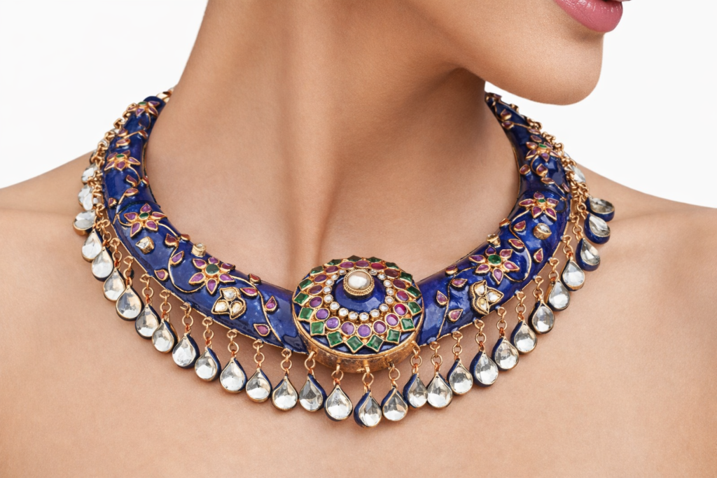 Meenakari is the art of enameling metal surfaces with vibrant mineral colors, creating jewelry that is as expressive as it is intricate. Introduced from Persia and perfected in India under Mughal patronage, Meenakari flourished especially in Rajasthan.