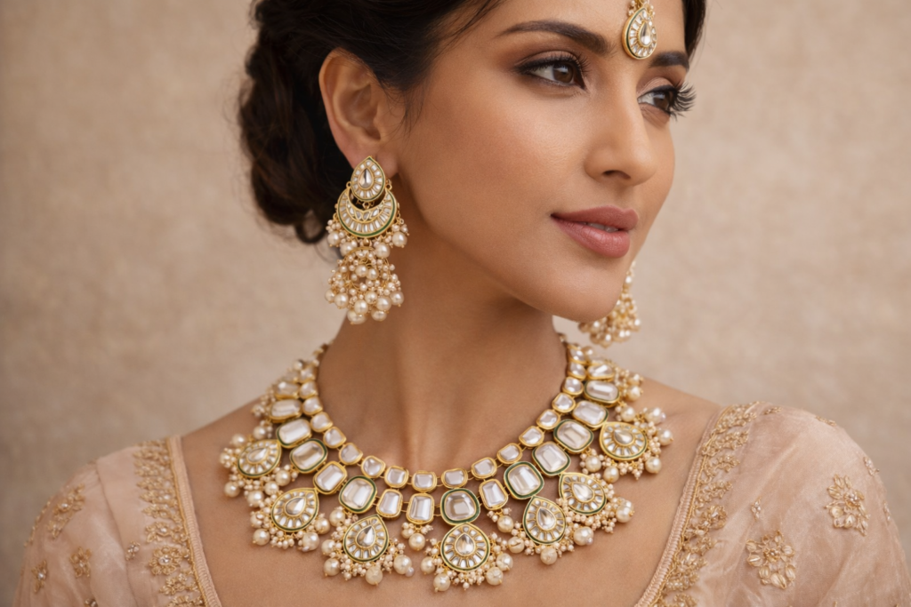 Kundan jewelry is among the oldest and most sophisticated forms of Indian ornamentation, reaching its artistic zenith during the Mughal era. The word Kundan refers to highly refined pure gold, used to mount uncut gemstones with extraordinary precision.