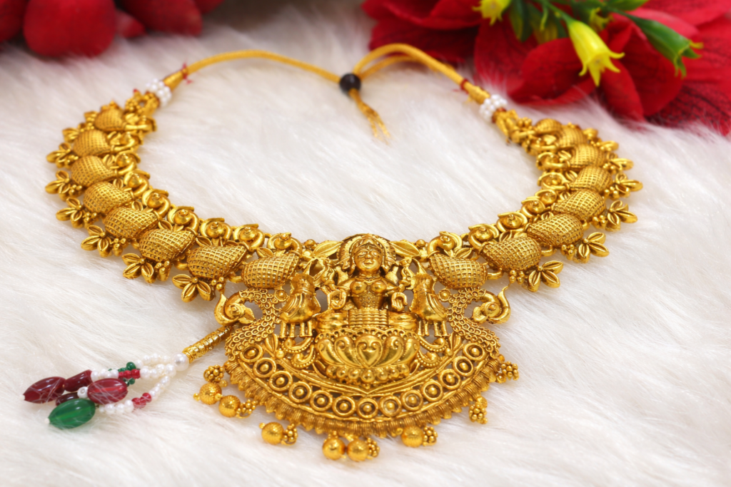 Temple jewelry originates from South India, where it was initially crafted to adorn temple deities. Over time, it became closely associated with classical dance forms such as Bharatanatyam and with ceremonial wear among aristocratic families.